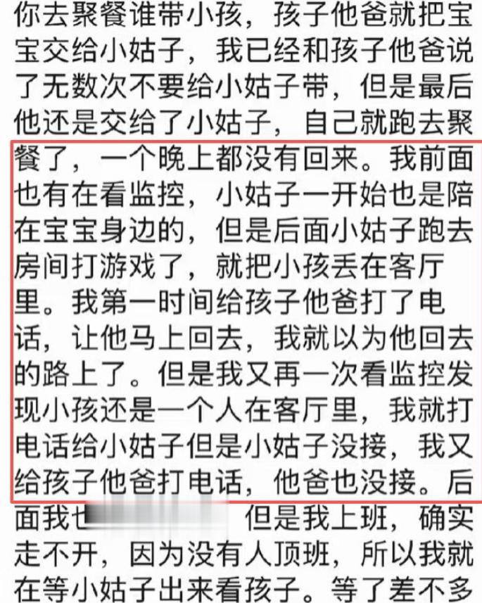 小姑子这边又是另一套说法,她强调自己离开的只是几分钟,就是取餐,上厕所这点空档,回来就继续照看,并不存在丢在客厅不管的情况,问题就在于,这两种版本都来自当事人的自述,谁都能把时间说得很像那么回事,可监控到底有没有更完整的记录,有没有储存,这事现在又成了新的罗生门。