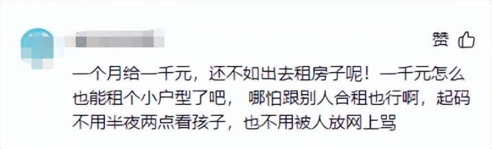 一个月给一千元,还不如出去租房子呢!一千元怎么也能租个小户型了吧, 哪怕跟别人合租也行啊,起码不用半夜两点看孩子,也不用被人放网上骂