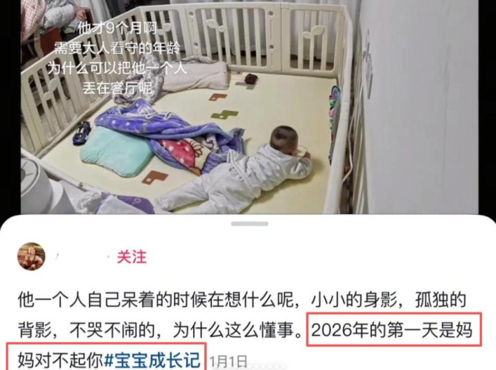 宝妈的配文其实也在往那个方向推,把那种被丢下的感觉直接拉满,她写得很扎心,孩子才九个月,正是最离不开人的时候,一个人孤零零待着,她说自己是临时被叫去加班的,趁工作间隙点开监控,本来是想看一眼孩子睡没睡,结果一眼看到那画面,心一下就凉了。