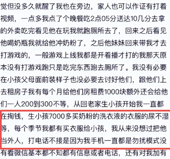 自己从七点多就开始带娃,十点多喂奶,凌晨一点多点外卖,两点零五取餐,吃完去厕所,出来就冲奶,她也直接否认那段时间在玩游戏,说手机开了勿扰,所以电话没听到。